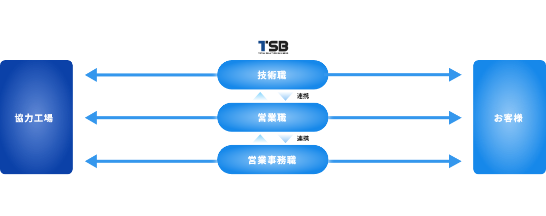 - お客様とサプライヤーをつなぎ、社内でもプロジェクトリーダーとして各部門を主導する、ティー・エス・ビーの中心を担う職種です。